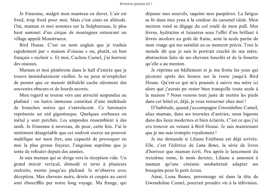 Dès que Cachou Camel met le pied dans l’hôtel Bird House, un manoir ancien, le décor sinistre lui fait peur. La situation s’empire quand sa mère est piégée par la tempête au sommet d’une montagne vertigineuse. Qui est réellement Khaleb, le mystérieux et séduisant réceptionniste ? Et que dire de l’inquiétante légende qui annonce un meurtre en cette nuit d’éclipse ?
